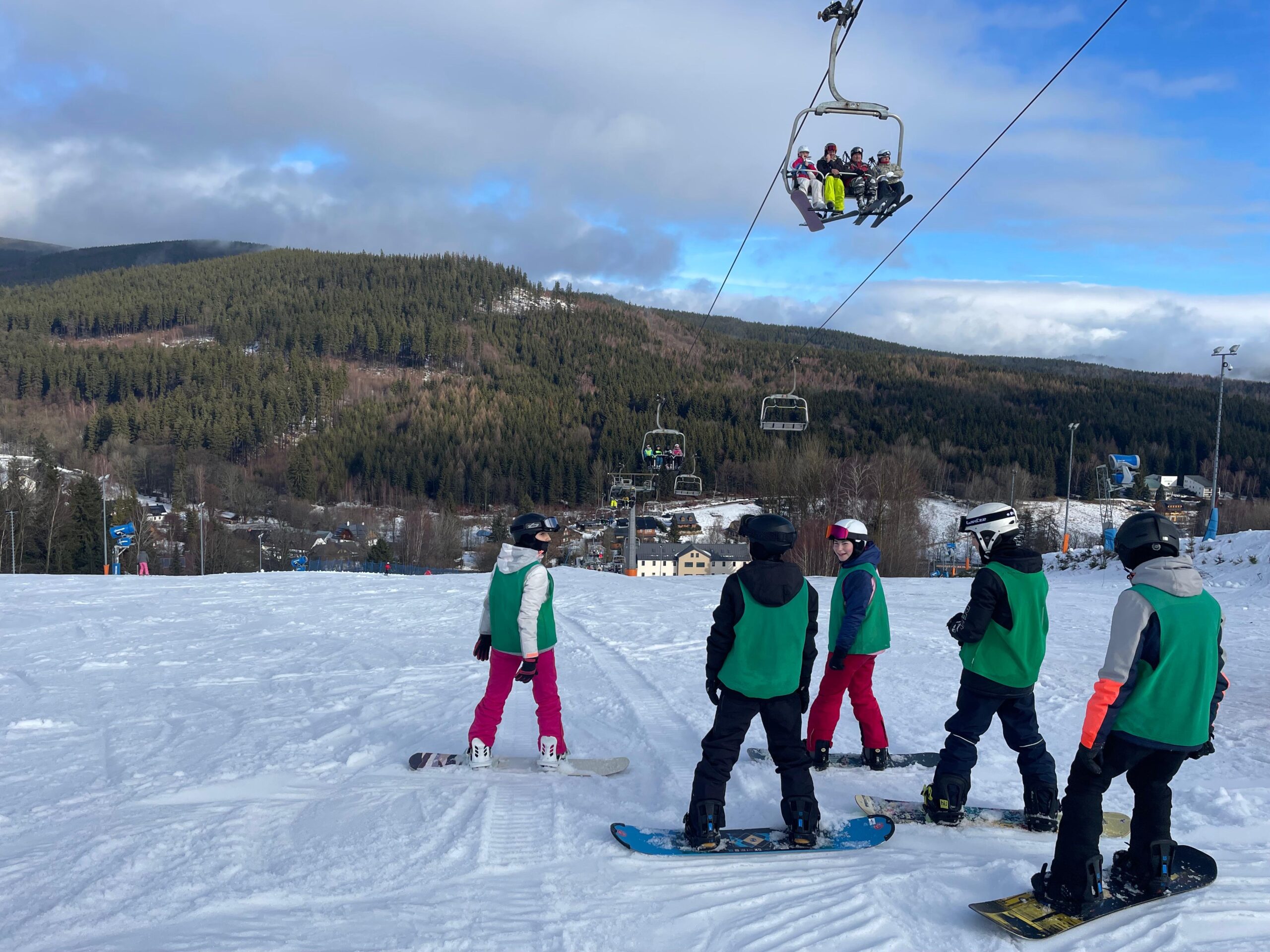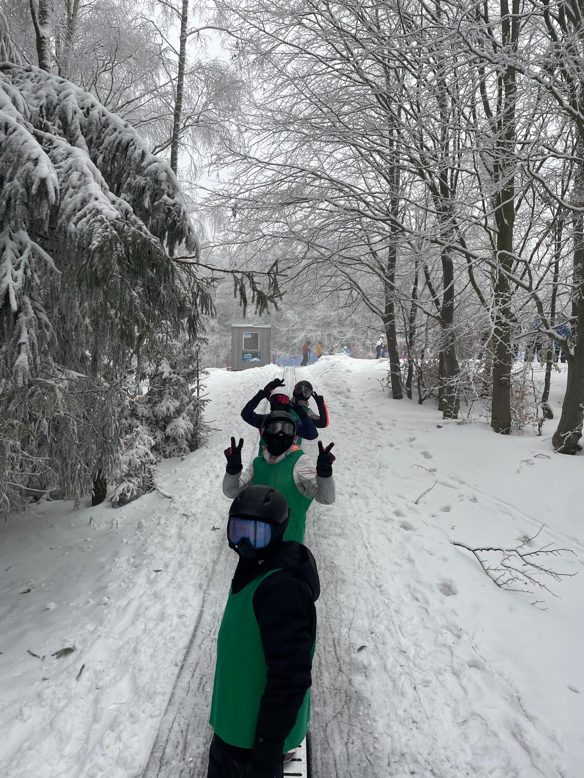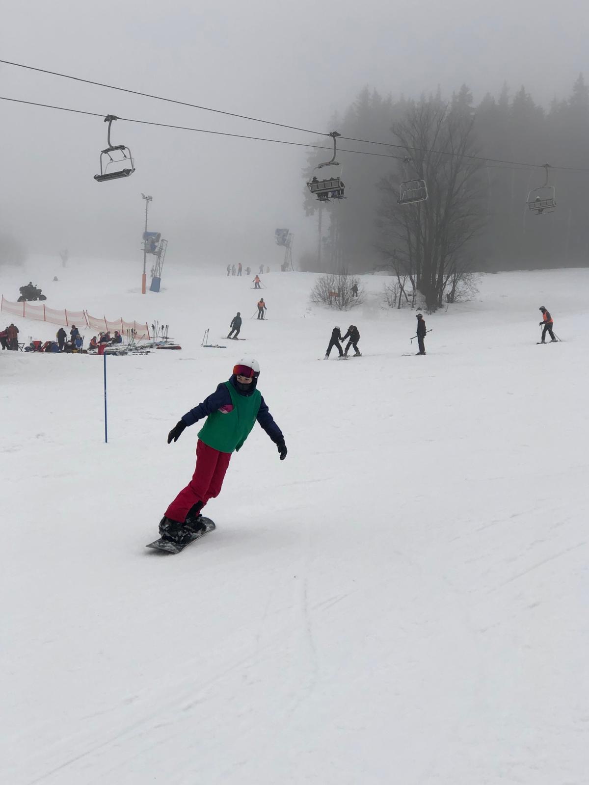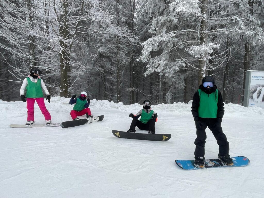 Na svahu jsme byli rozděleni do skupin: lyžaři začátečníci, mírně pokročilí, pokročilí a snowboardisté, které vedl Matěj Švan, a snowboardisté začátečníci pod vedením paní učitelky Švanové.