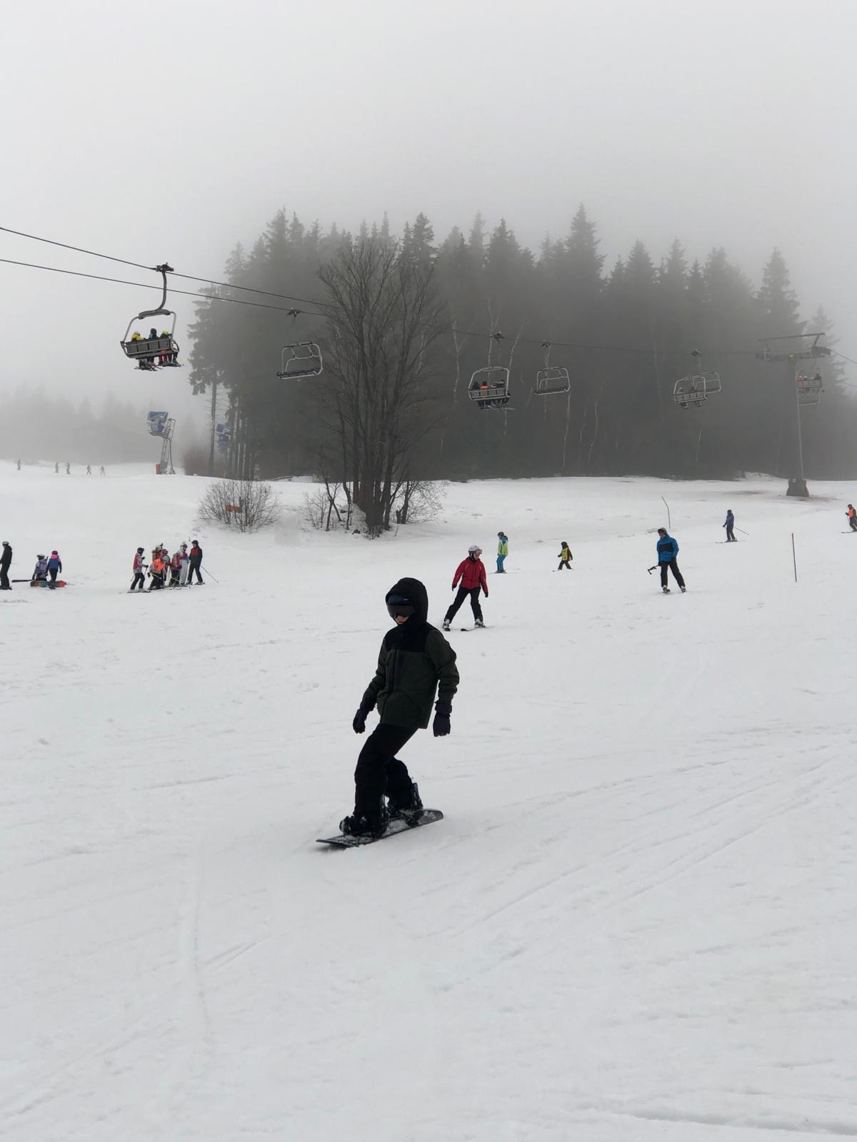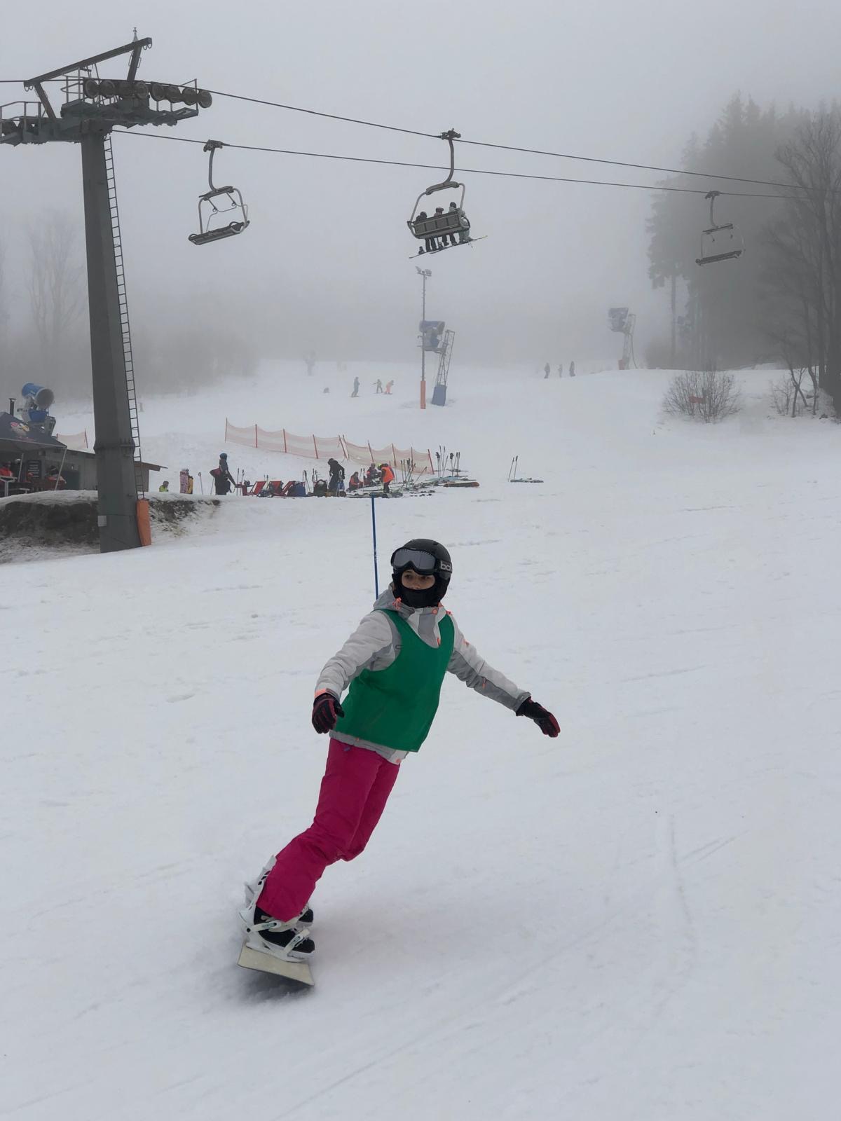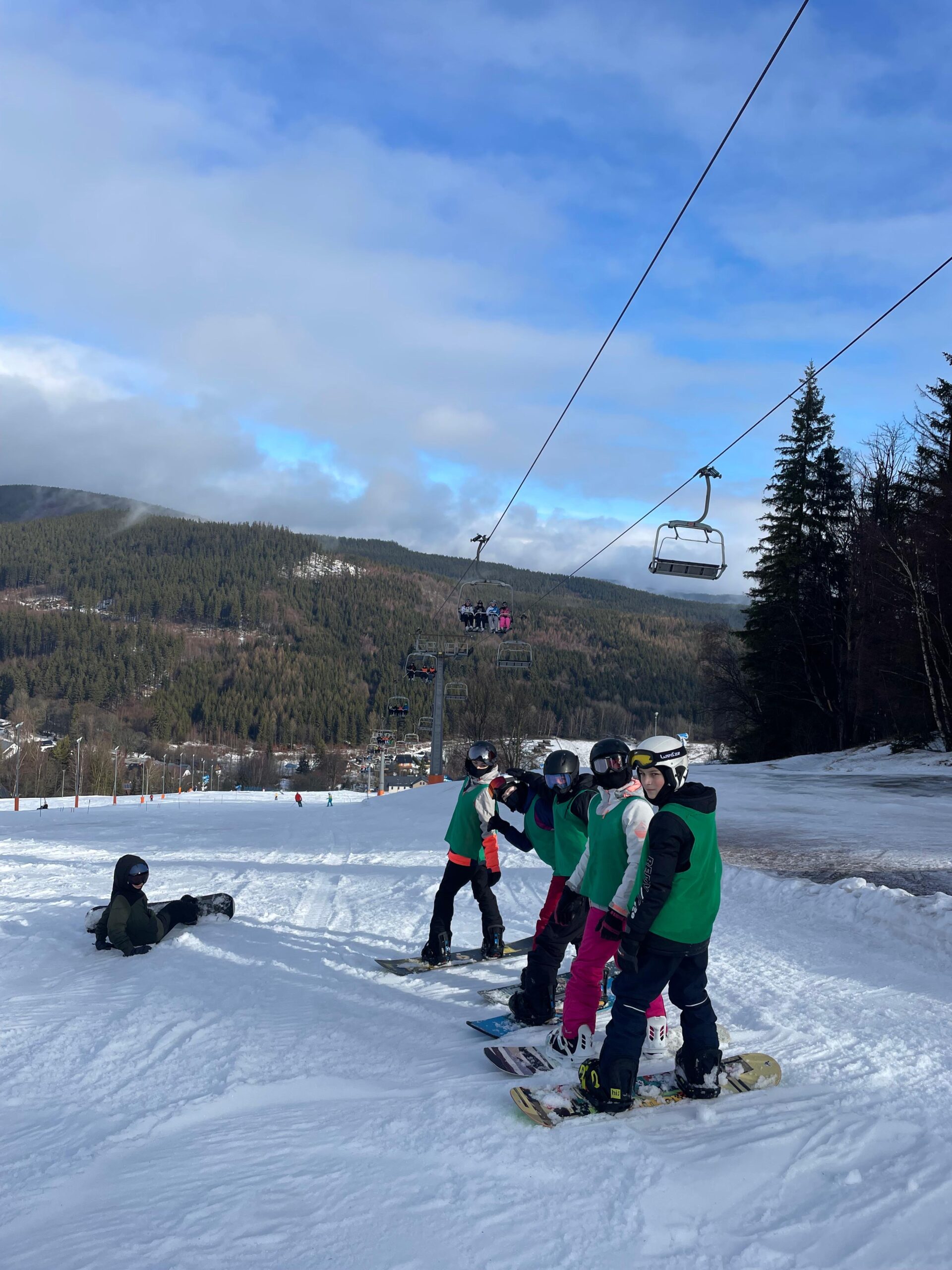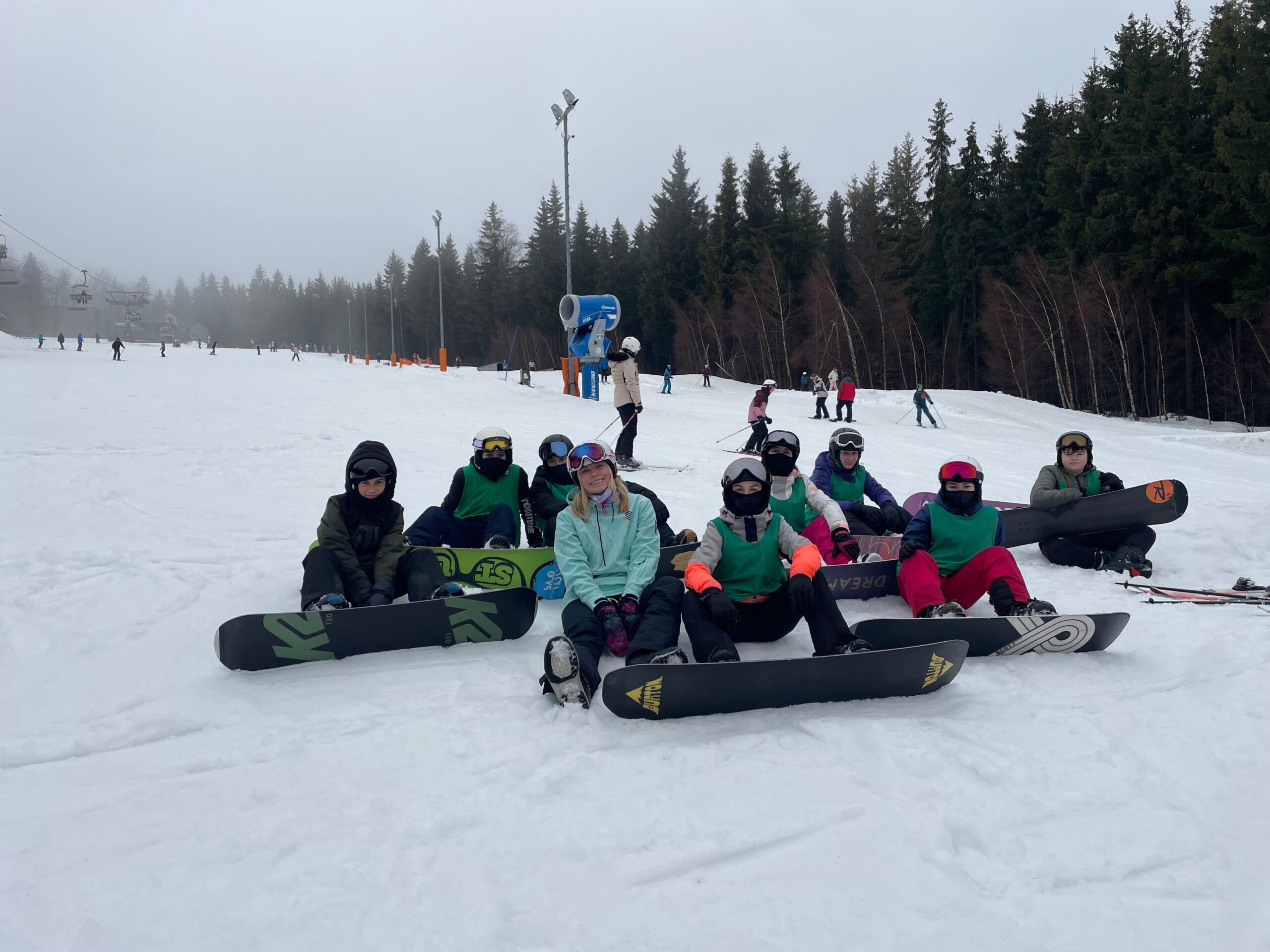 Na svahu jsme byli rozděleni do skupin: lyžaři začátečníci, mírně pokročilí, pokročilí a snowboardisté, které vedl Matěj Švan, a snowboardisté začátečníci pod vedením paní učitelky Švanové.