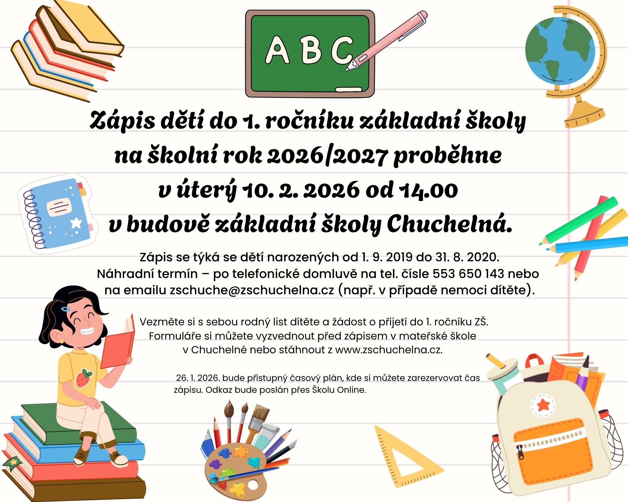 V úterý 10. února od 14 hodin probíhá v budově základní školy zápis dětí do 1. ročníku pro školní rok 2026/2027.