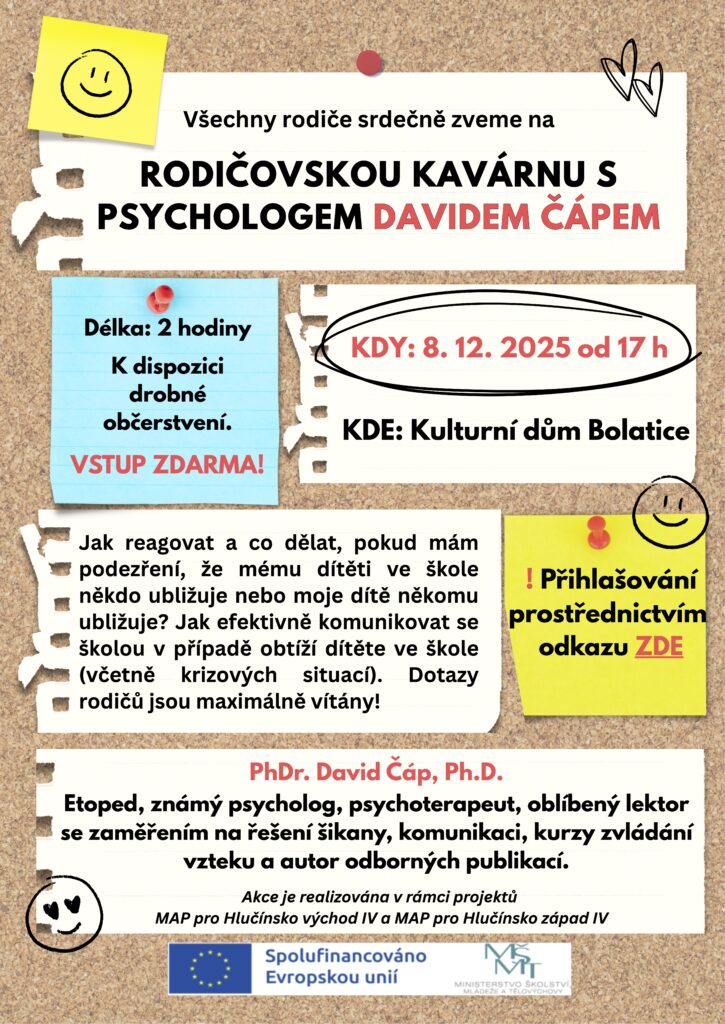 V pondělí 8. 12. Vás zveme na Rodičovskou kavárnu s psychologem Davidem Čápem od 17 do 19 hodin v Kulturním domě v Bolaticích.